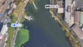 航空写真を見てもわかるように,河川に入るにつれて川幅が狭くなっており,この放水量によって流れが早すぎてアプローチできない時もあるほど。