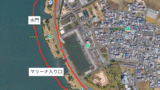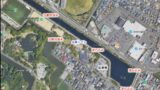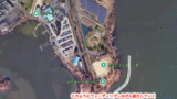 航空写真を見てもわかるように,河川に入るにつれて川幅が狭くなっており,この放水量によって流れが早すぎてアプローチできない時もあるほど。